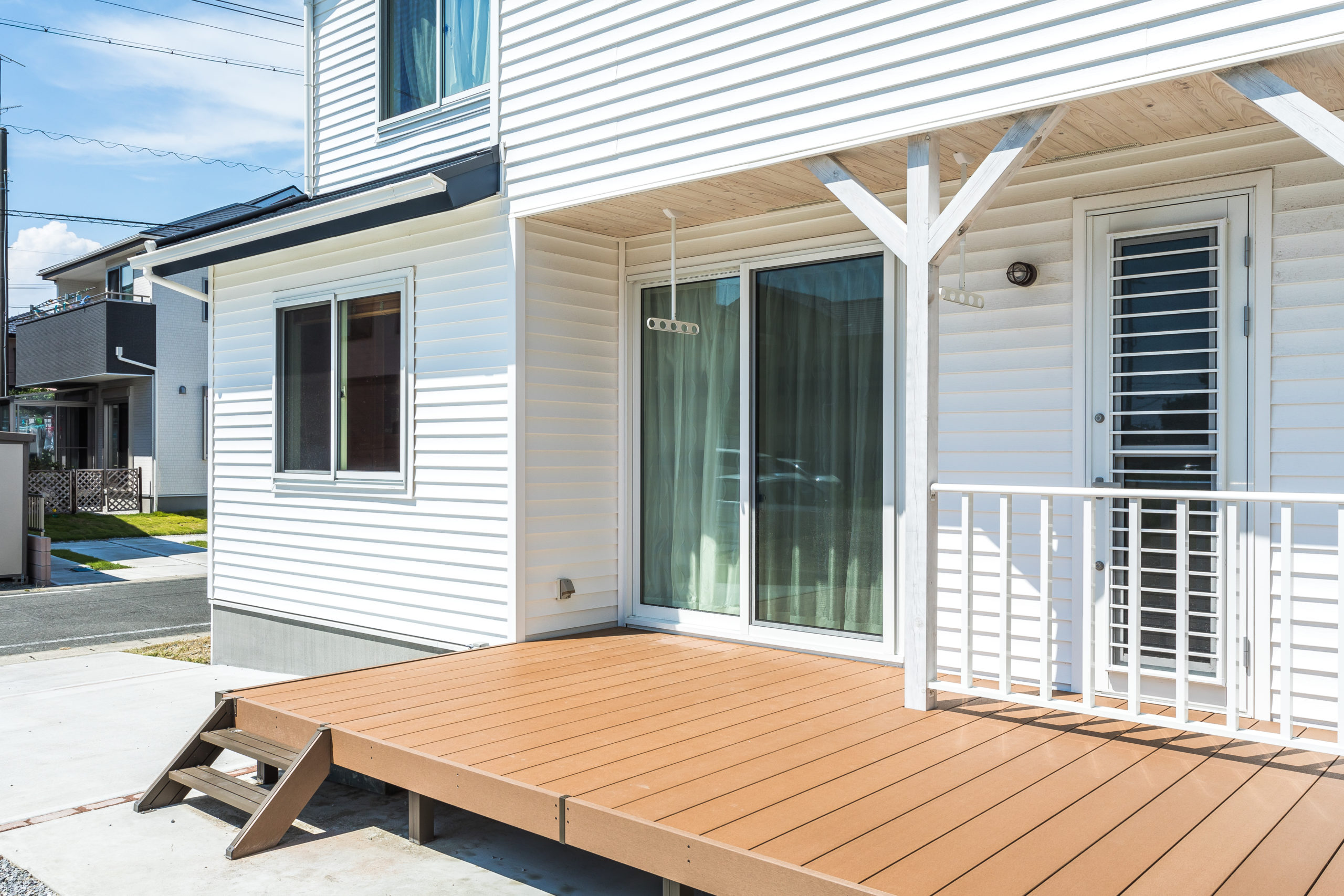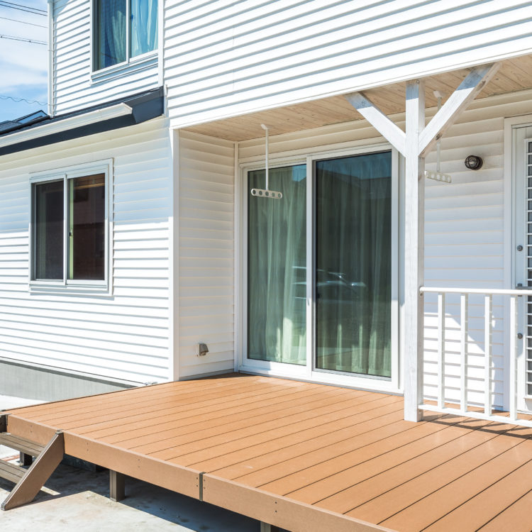 ウッドデッキは木製と木調樹脂製がありますが、今回メンテナンス性を重視して木調樹脂製のウッドデッキを採用しています。