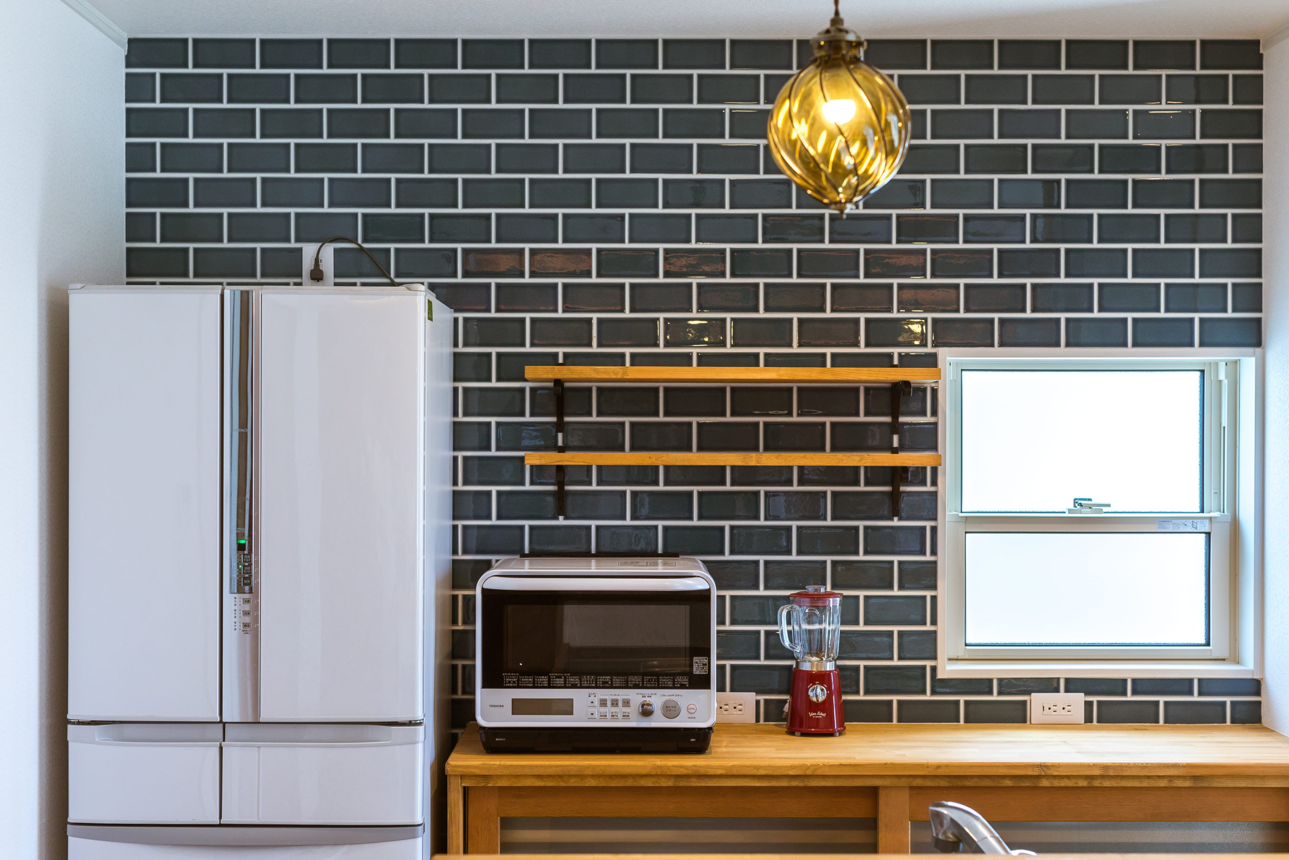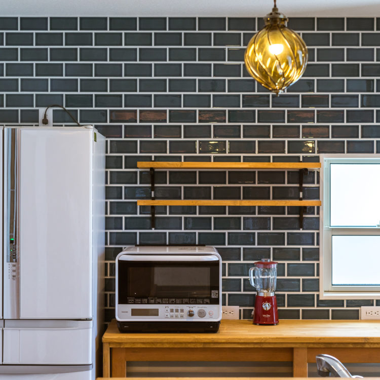キッチンは収納側にはディープグリーンの「サブウェイタイル」を採用しました。