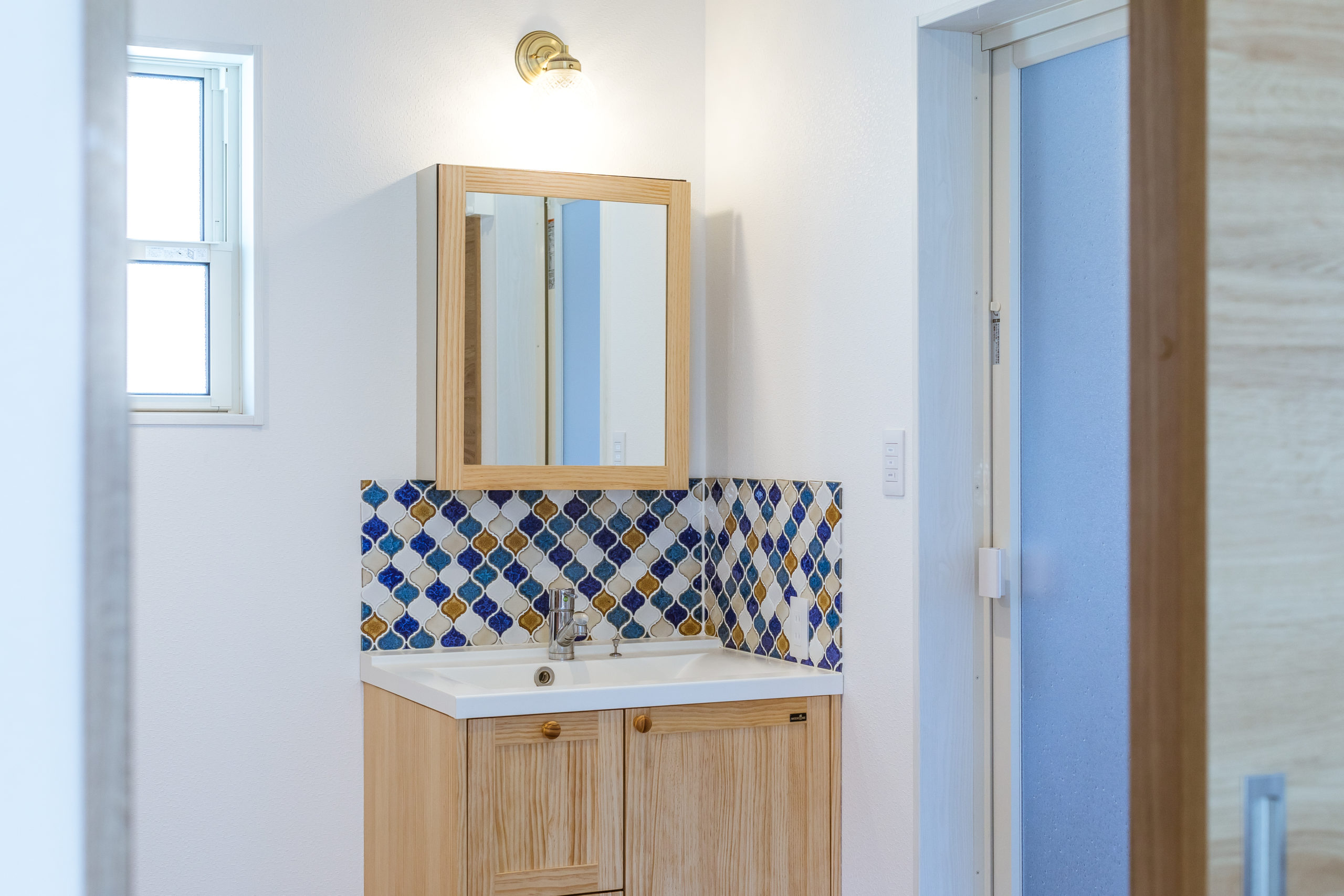 脱衣所には無垢材を使用した温かみのある化粧台と「コラベルタイル」を採用しました。
