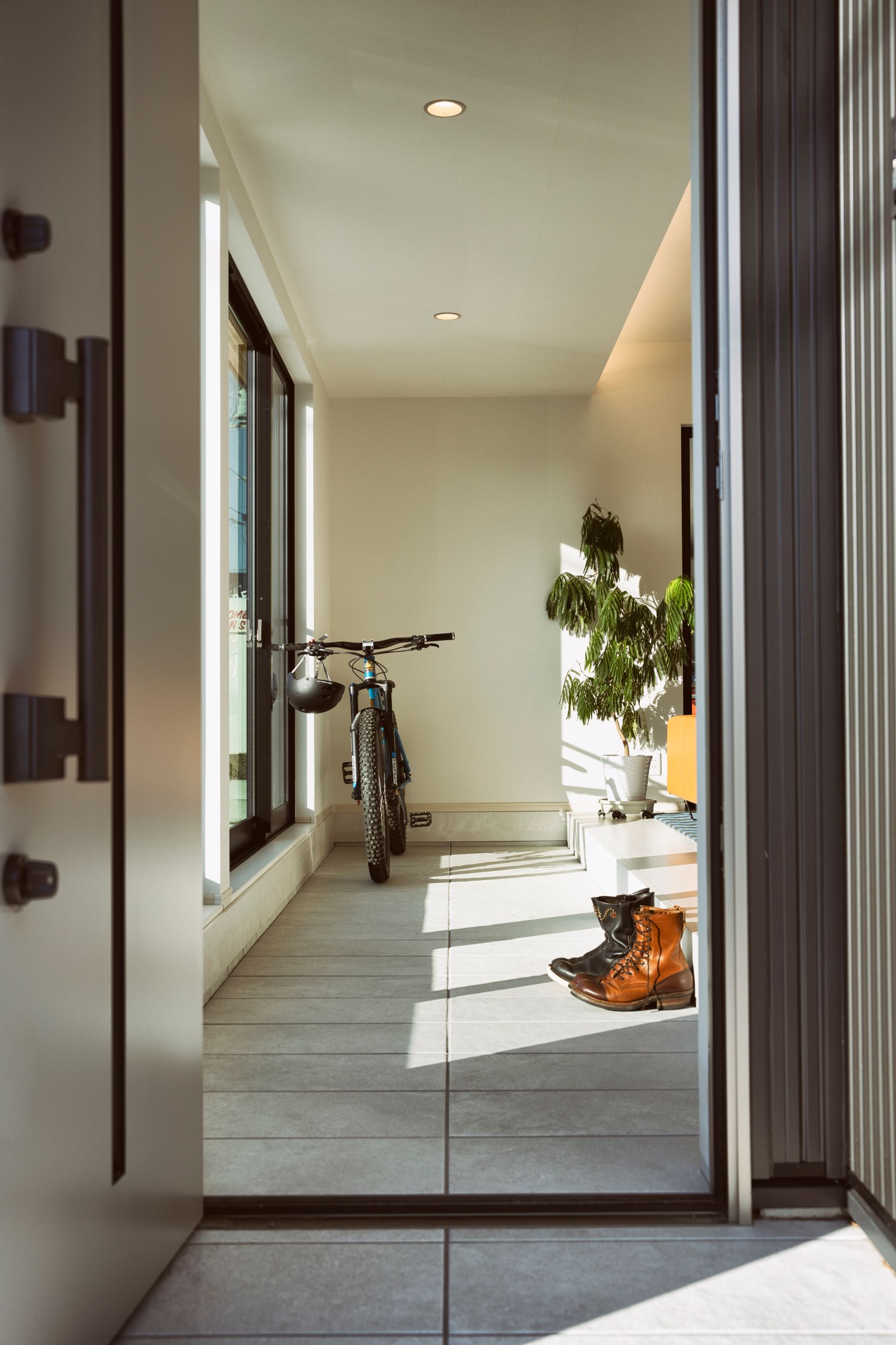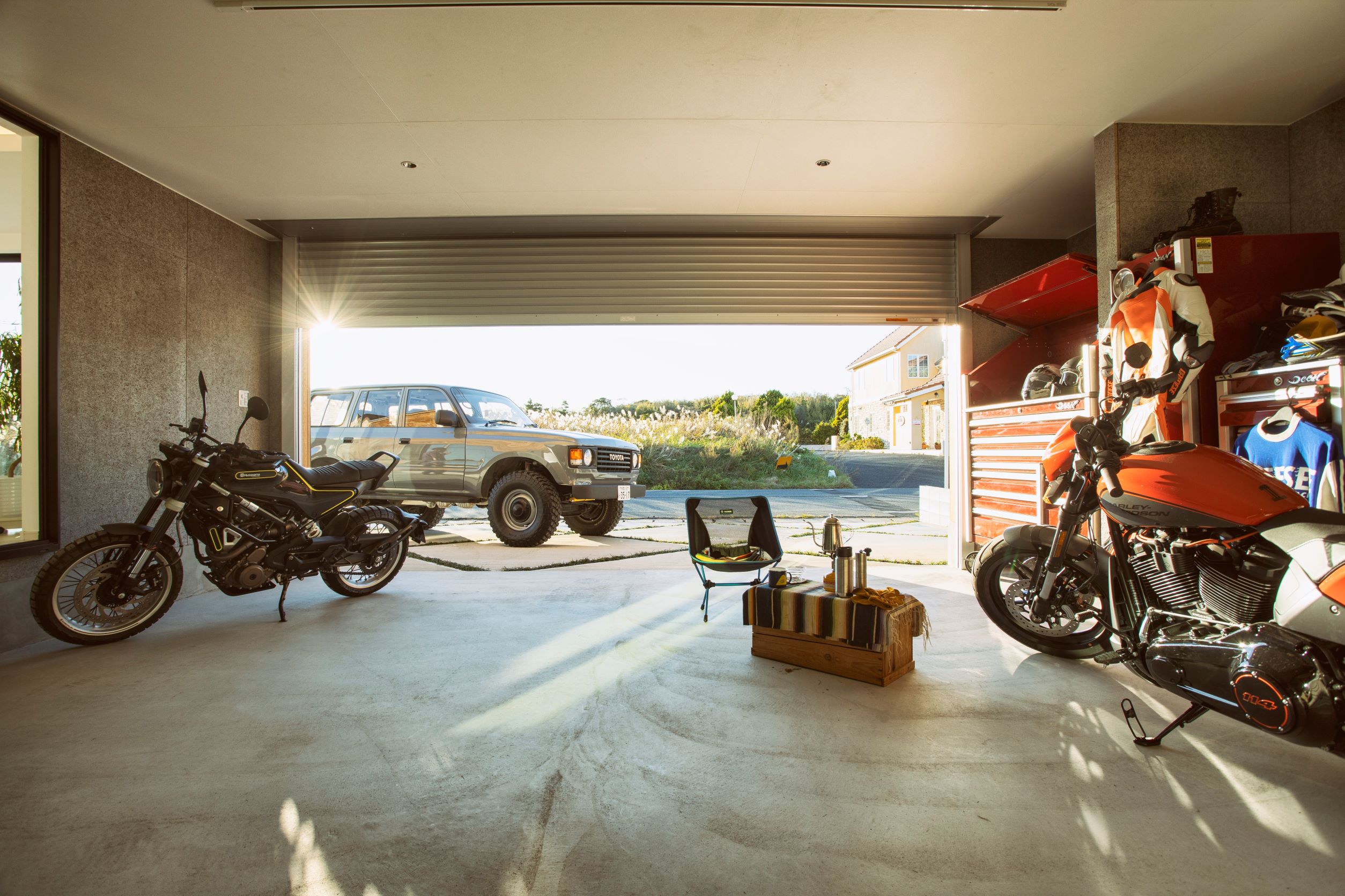 また、ガレージ内にはバイクを整備するための工具類を収納する十分なスペースだけでなく、エアコンも設置することで快適に趣味の時間を過ごすことができます。