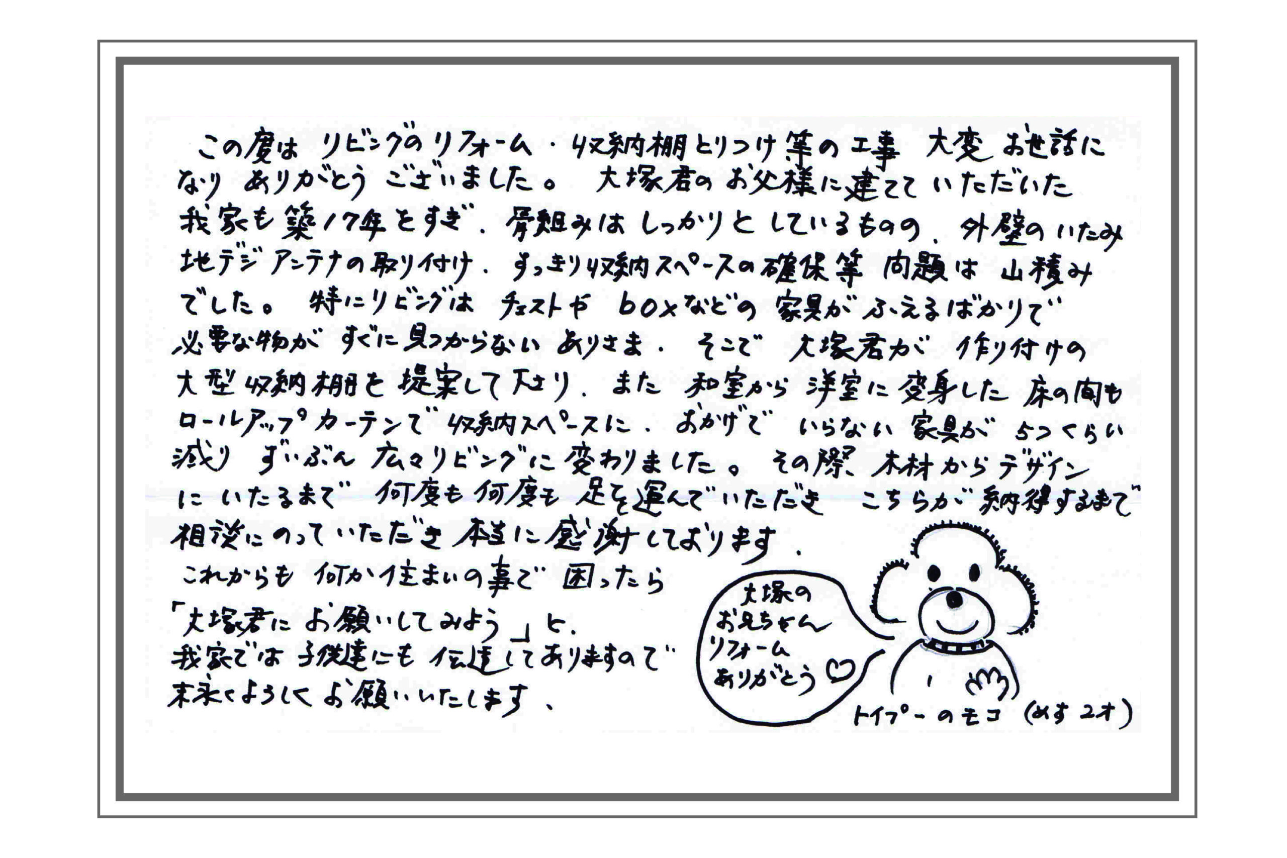 これからも何か住まいの事で困ったら、「大塚君にお願いしてみよう」と、我が家では子供たちにも伝達してありますので、末永くよろしくお願いいたします。